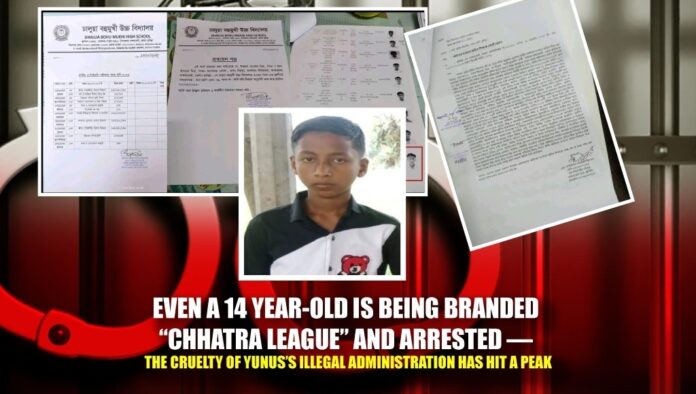 The interim administration led by Muhammad Yunus stands accused of a grotesque violation of human and child rights following the arrest of a 14-year-old eighth-grade student, identified only as Imran. The arrest, which opponents label a politically motivated act of revenge, starkly exposes the state’s reckless abuse of power and the complete breakdown of the rule of law.
